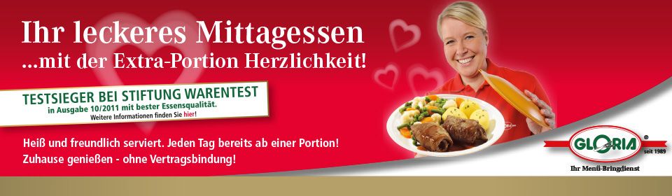 Wir freuen uns, Sie auf unseren Internetseiten begrüßen zu dürfen und möchten Sie an dieser Stelle über alles Wissenswerte rund um den GLORIA Menü-Bringdienst und unseren Essen auf Rädern - Service informieren.