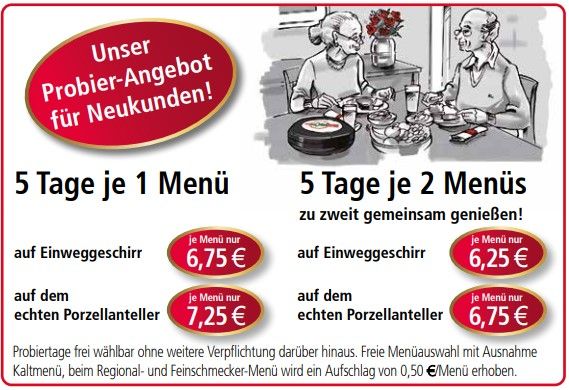 Sie haben sich noch nicht unsere leckeren Menüs liefern lassen? Dann probieren Sie doch einfach mal ganz unverbindlich den Service und die Qualität unseres Menü-Bringdienstes! Das Angebot gilt einmalig pro Neukunde und kann mit Ausnahme des Kaltmenüs frei gewählt werden. Beim Menü "Spezielles & Regionales" sowie dem "Feinschmecker"-Menü wird ein Aufschlag von 0,50 € erhoben.